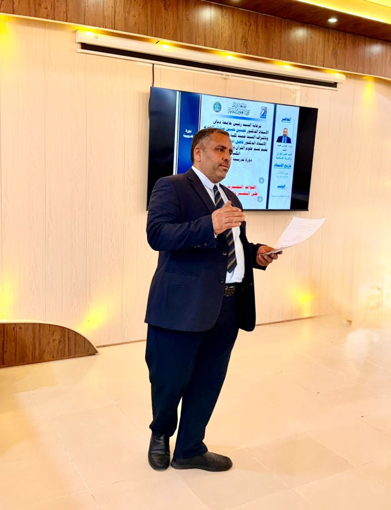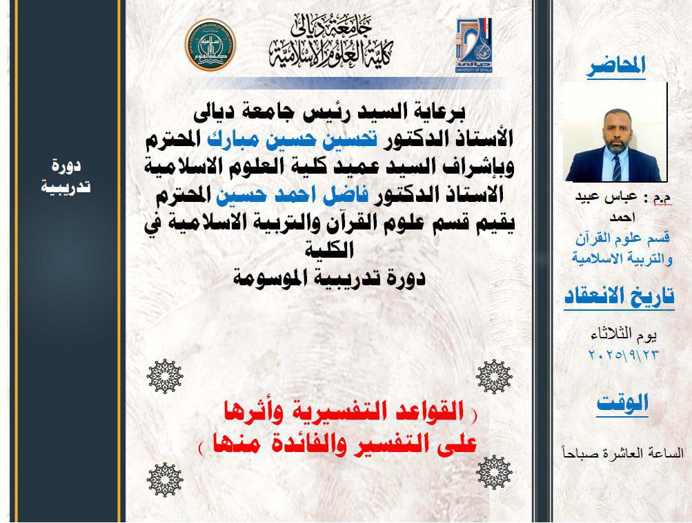 اقام قسم علوم القرآن والتربية الاسلامية جامعة ديالى دورة تدريبية بعنوان القواعد التفسيرية وأثرها على التفسير والفائدة منها بمشاركة عدد من التدريسيين وطلبة الدراسات العليا . ادار الدورة المدر المساعد عباس عبيد احمد