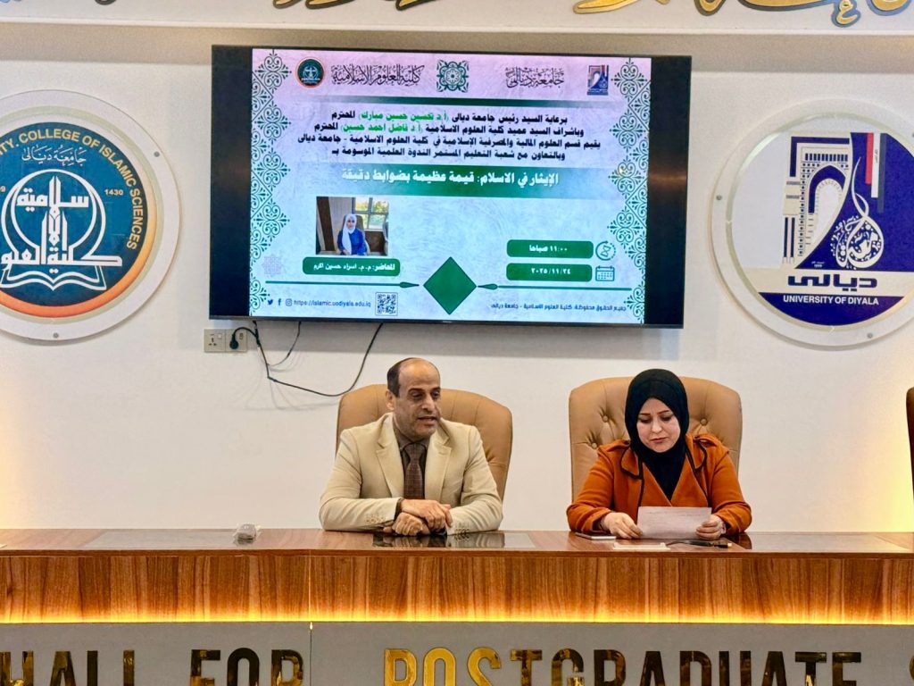 اقام قسم العلوم المالية والمصرفية الاسلامية في كلية العلوم الإسلامية بجامعة ديالى ندوة علمية بعنوان (الإيثار في الإسلام: قيمة عظيمة بضوابط دقيقة )بحضور السيد رئيس القسم الاستاذ الدكتور رعد سليمان حسين ومجموعة من التدريسيين والطلبة.