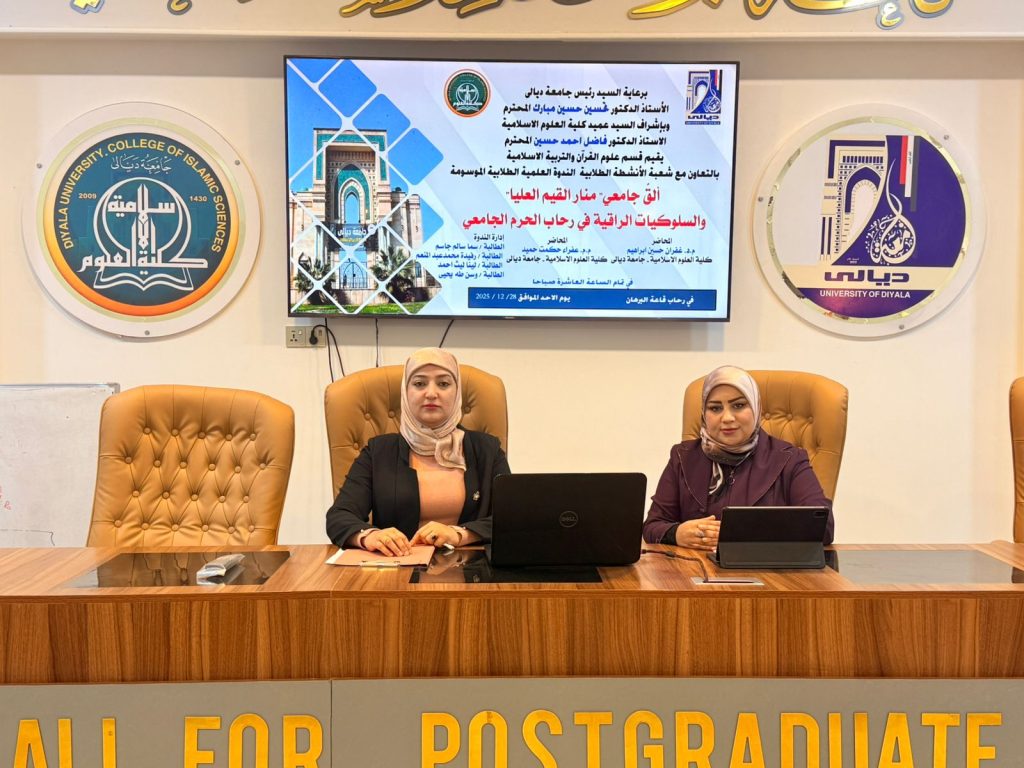 في كلية العلوم الاسلامية جامعة ديالى وبالتعاون مع وحدة الأنشطة الطلابية في كلية العلوم الإسلامية ندوة علمية توعوية الموسومة (ألق جامعي منار القيم العليا والسلوكيات الراقية في رحاب الحرم الجامعي)