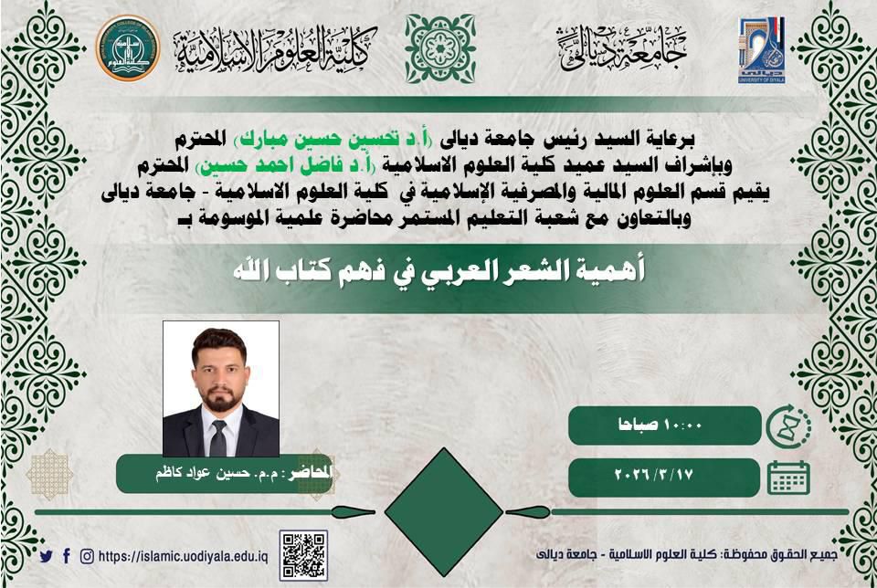 أقام قسم العلوم الناليك والمصرفية الاسلامية في كلية العلوم الإسلامية ندوة علمية توعوية بعنوان )أهمية الشعر العربي في فهم القرآن الكريم )بحضور عدد من أساتذة وطلبة الجامعة. ادار الندوة (م.م حسين عواد كاظم )