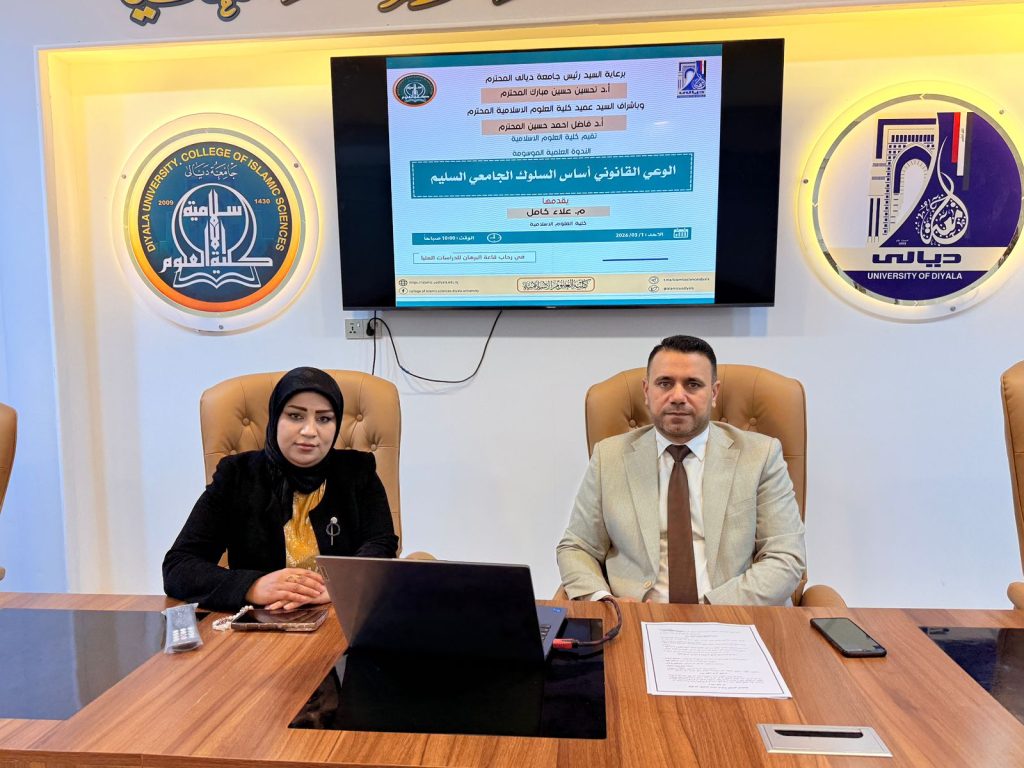 نظمت كلية العلوم الإسلامية في جامعة ديالى ندوة علمية موسومة بعنوان (الوعي القانوني أساس السلوك الجامعي السليم ) قدمها المدرس (م. علاء كامل عبد) والمدرس المساعد (م.م عفراء حكمت)