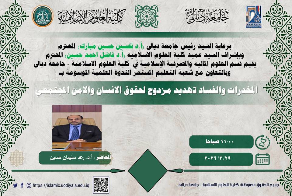 اقام قسم العلوم المالية والمصرفية الاسلامية في كلية العلوم الإسلامية جامعة ديالى ندوة علمية بعنوان (المخدرات والفساد تهديد مزدوج لحقوق الإنسان والأمن المجتمعي ) بمشاركة نخبة من التدريسيين وبحضور عدد من الطلبة .ادار الندوة الاستاذ الدكتور (رعد سليمان حسين )