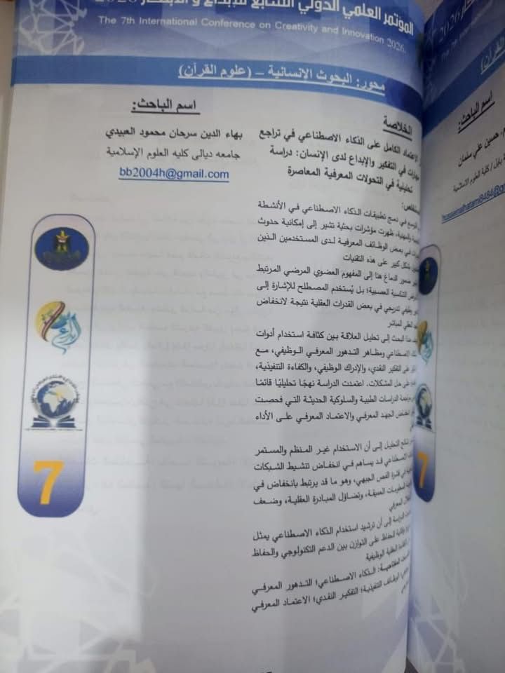 وتميّزت مشاركته بتقديم بحث علمي بعنوان (أثر الاعتماد الكامل على الذكاء الاصطناعي في تراجع مهارات التفكير والإبداع لدى الإنسان: دراسة تحليلية في التحولات المعرفية المعاصرة)