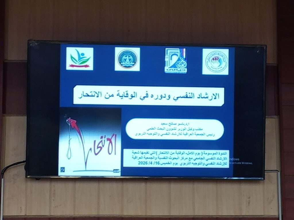 أقامت شعبة الإرشاد النفسي الجامعي بالتعاون مع مركز البحوث النفسية والجمعية العراقية للإرشاد النفسي والتوجيه التربوي ووحدة الإرشاد النفسي الجامعي في كلية العلوم الإسلامية ندوة علمية موسومة بـ (يوم الأمل – الانتحار) وذلك يوم الخميس الموافق 16/4/2026 في تمام الساعة التاسعة صباحاً وبحضور نخبة من التدريسيين والطلبة والمهتمين بالشأن النفسي والتربوي.