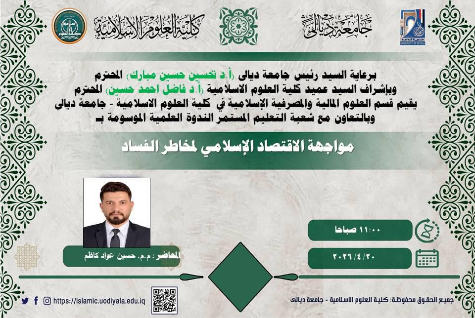 أقامت قسم العلوم المالية والمصرفية الاسلامية في كلية العلوم الإسلامية ندوة علمية بعنوان (مواجهة الاقتصاد الإسلامي لمخاطر الفساد )وذلك في إطار سعيها لتعزيز الوعي الاقتصادي القائم على القيم الإسلامية ومكافحة الظواهر السلبية التي تؤثر في التنمية والاستقرار. ادار الندوة المدرس المساعد (حسين عواد كاظم )