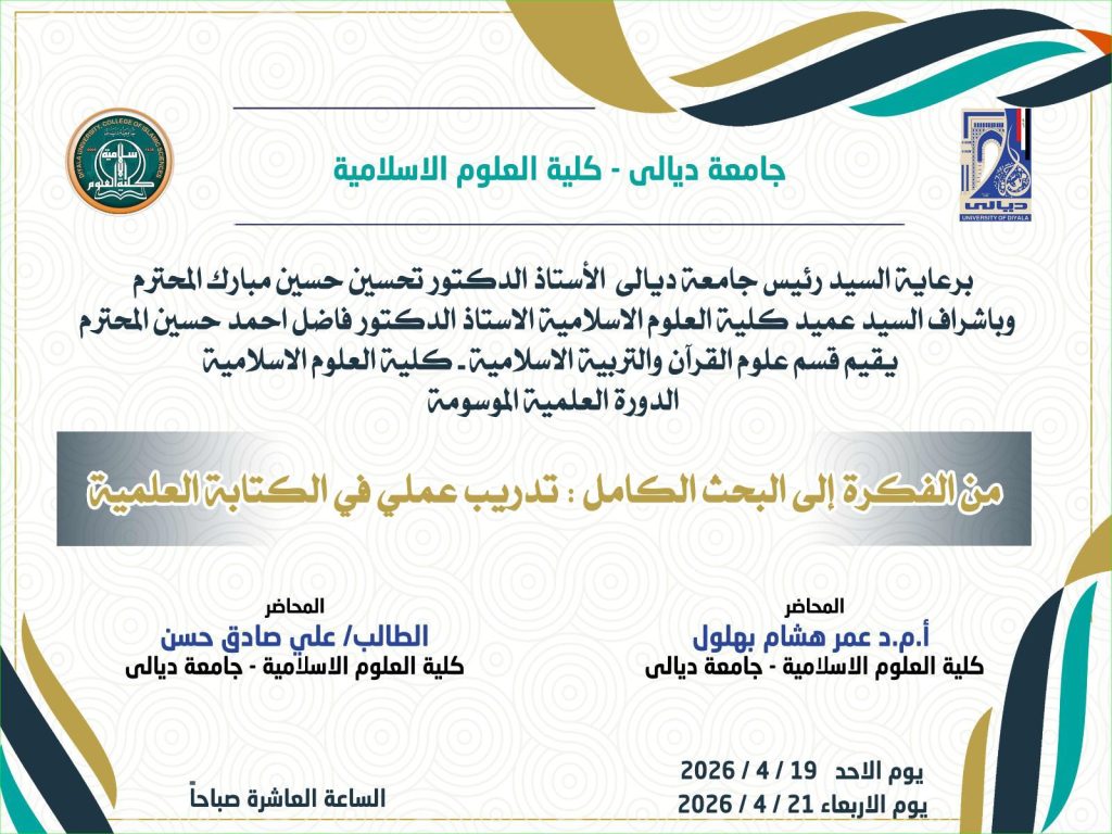 أقام قسم علوم القرآن والتربية الإسلامية في كلية العلوم الإسلامية جامعة ديالى دورة علمية بعنوان (من الفكرة إلى البحث الكامل: تدريب عملي في الكتابة العلمية ) والتي استهدفت طلبة المرحلة الثالثة بهدف تنمية مهاراتهم في إعداد البحوث العلمية وفق الأسس الأكاديمية الرصينة.